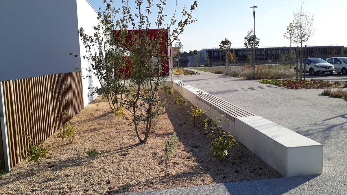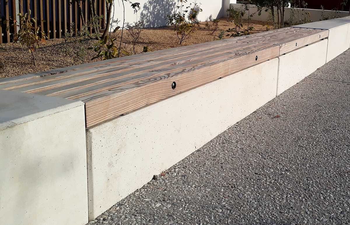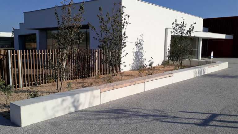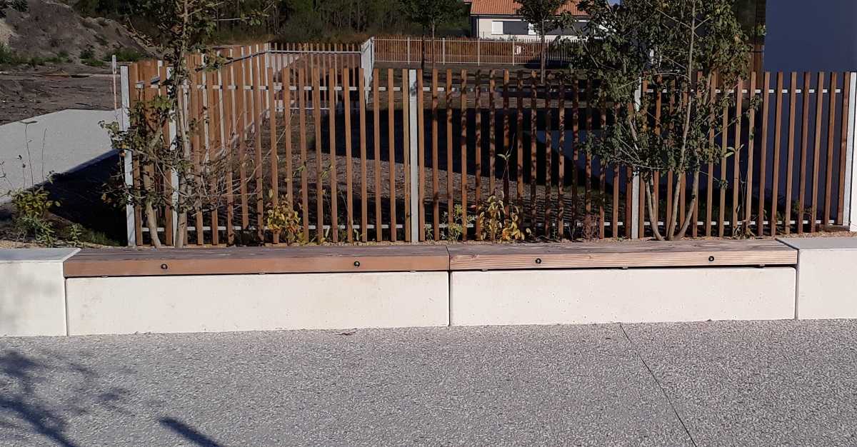 Comme pour le projet de Biscarrosse, nous avons fournis la banquette en béton, la partie bois était en lot séparé. Nous recommandons une fixation mécanique et chimique de l’assise.