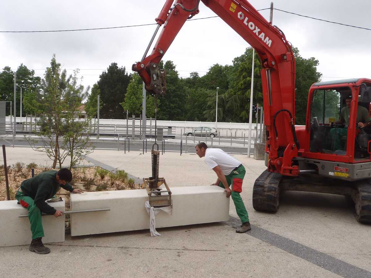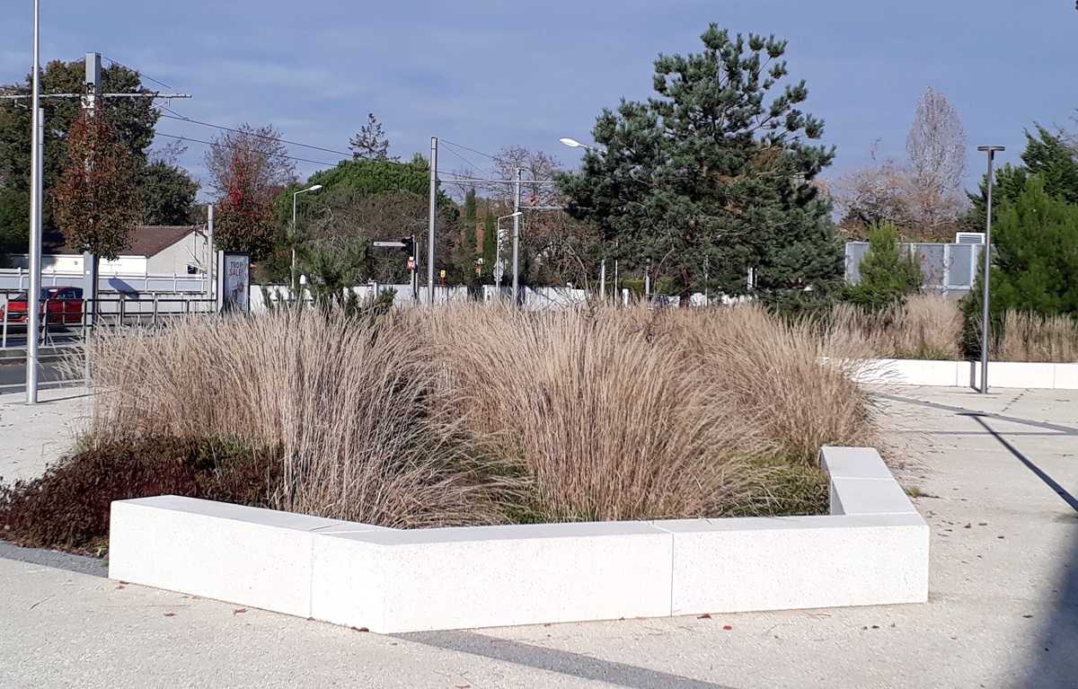 Madame Carvel souhaitait un mobilier urbain qui s’adosserait aux plantations tout en soulignant la géométrie des massifs, la structure et les couleurs du parvis, afin de créer des lieux de convivialité.